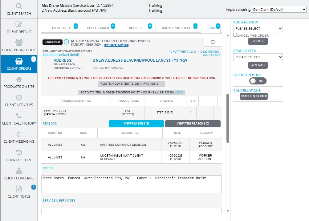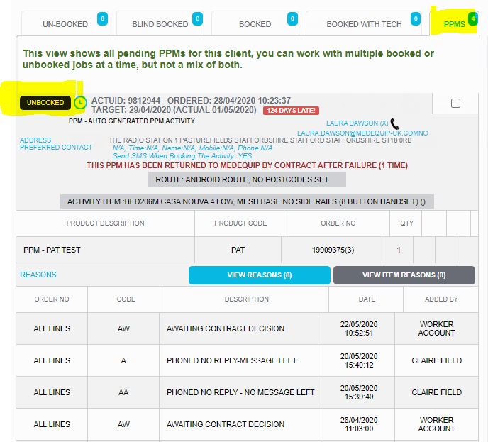 If a PPM has been returned from the contract, you will notice a new message in red will appear on the order stating "This PPM has been returned to MQP by the contract after failure (1 time)". This means we now need to try this PPM again and it will appear in the routes for booking and within the Unbooked section of the client order screen.