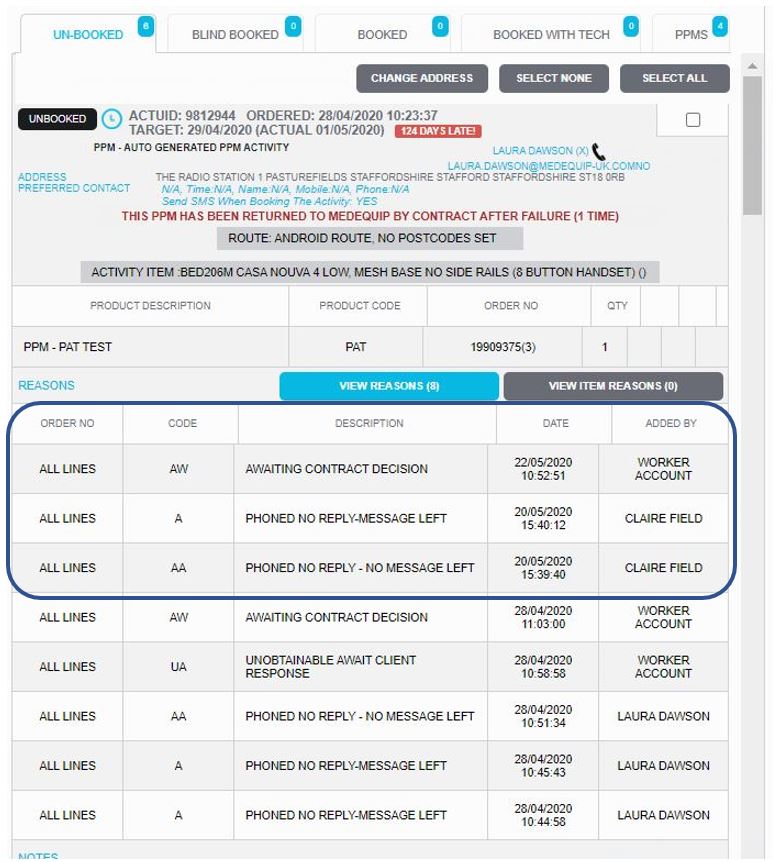 The PPM can go back to the contract twice. If after two attempts, you are still unable to gain contact with the service user. On the second attempt to gain contact with the service user. The reason code "Unobtainable – Second attempt" will be applied. This means the PPMs has finished its journey with Medequip and will appear in the PPM unobtainable report with the new reason code for the contract to see.